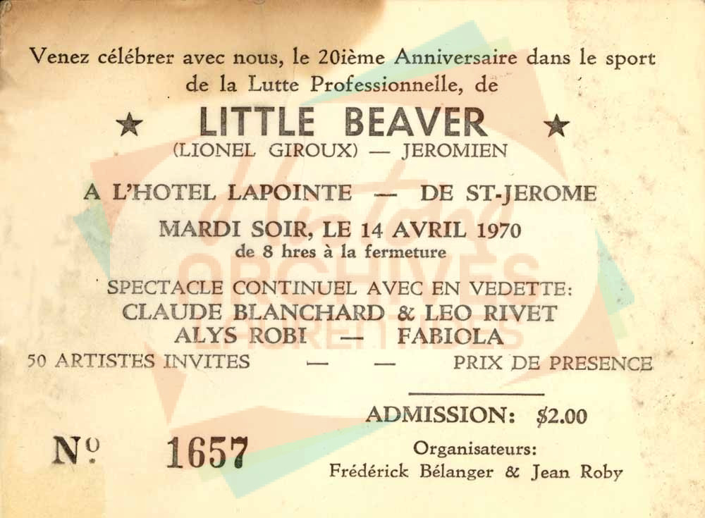 Billet d’entrée pour le 20e anniversaire de carrière du lutteur jérômien Lionel Giroux, alias Little Beaver, à l’Hôtel Lapointe.