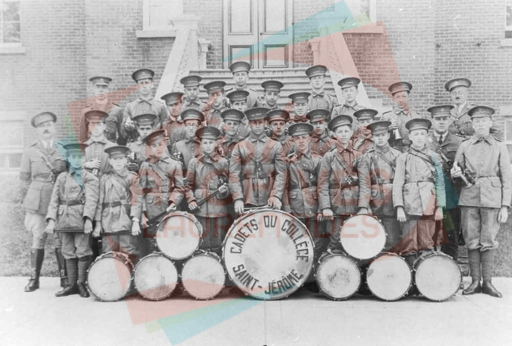 Cadets du Collège commercial de Saint-Jérôme. Ils sont debout, en uniforme, avec des tambours, devant l’entrée du collège.