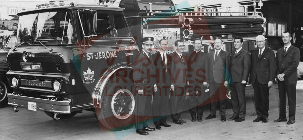 Groupe d’hommes, dont le chef de pompiers Claude Lacasse (1er à gauche), devant un camion de la Ville de Saint-Jérôme.