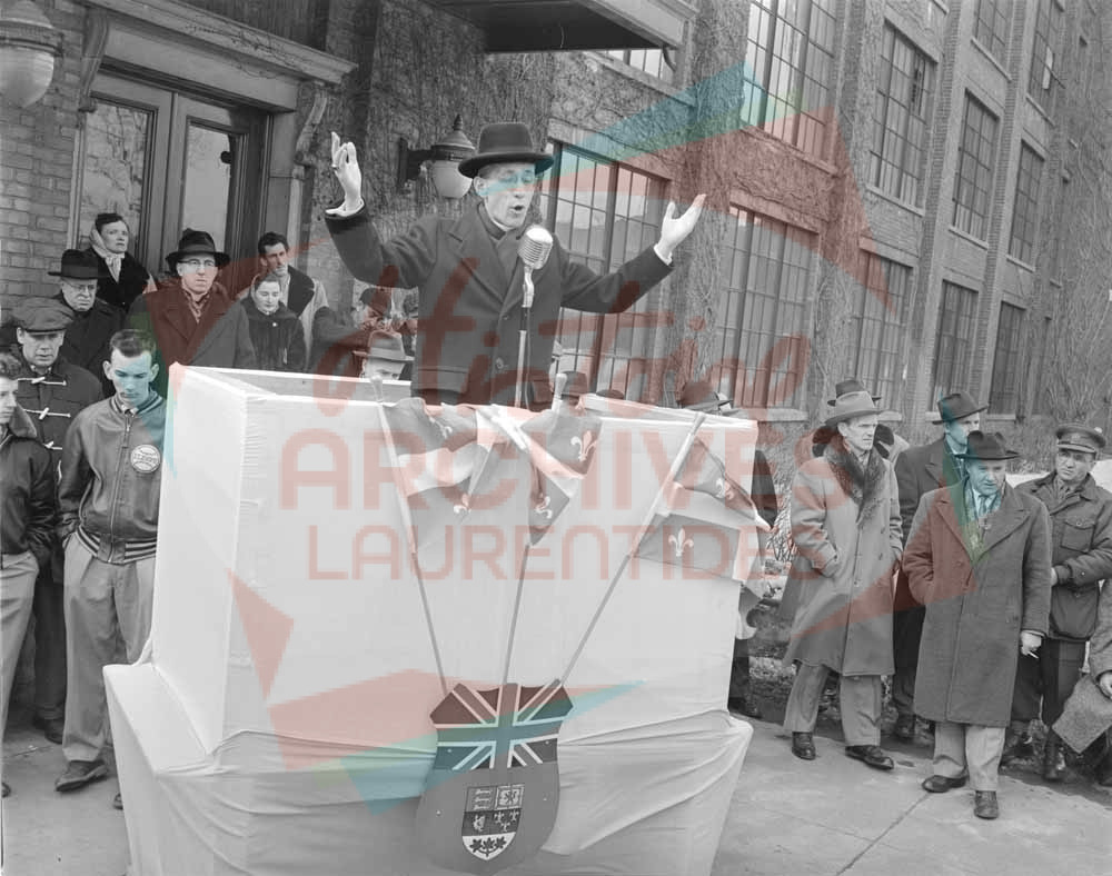 Monseigneur Frenette, évêque de Saint-Jérôme, faisant un discours à la Dominion Rubber pour le lancement de la campagne de souscription pour la Fédération des oeuvres de charité.