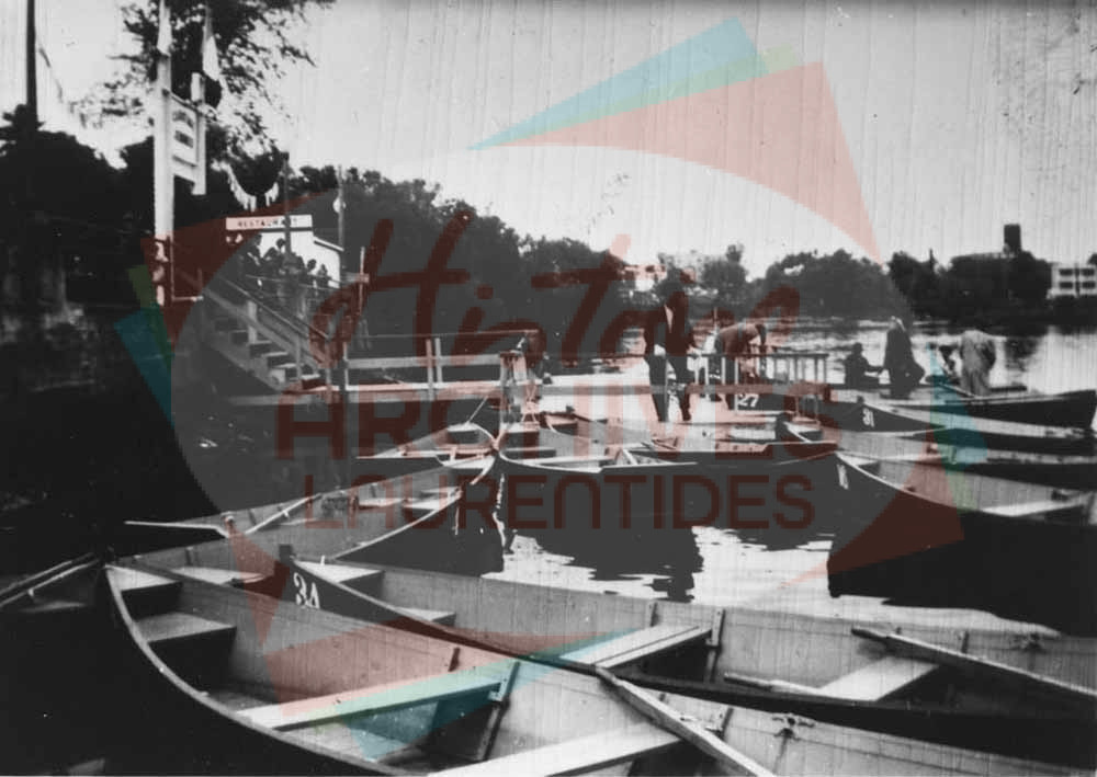 Canotage Jérômien, installé au parc De La Durantaye vers 1948. Leurs activités cessent en 1954. On y voit les quais ainsi que les canots sur la rivière du Nord.