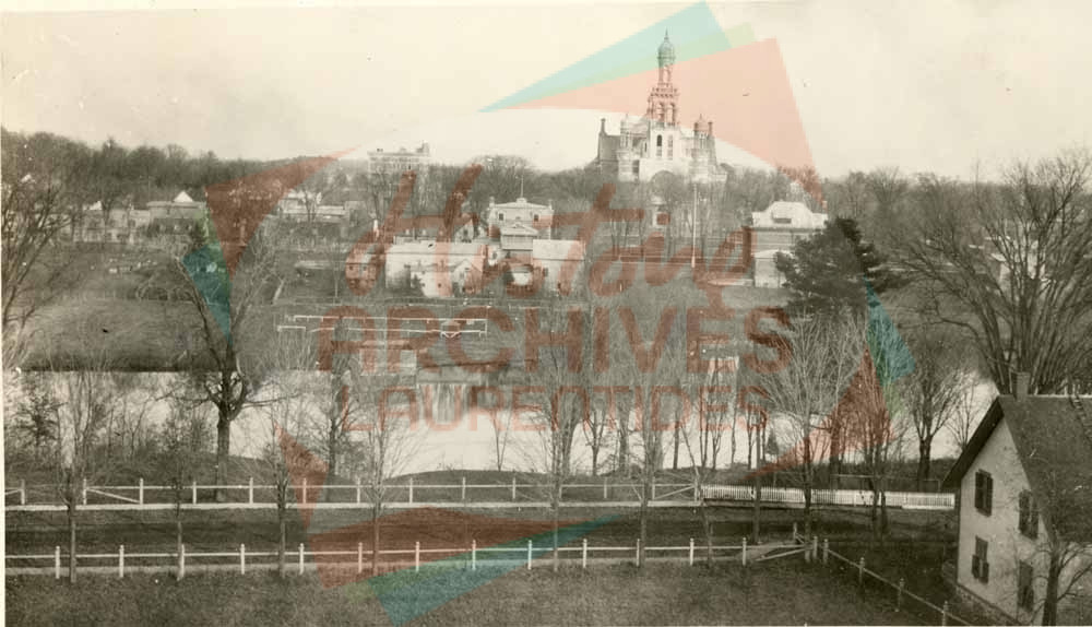 Centre-ville de Saint-Jérôme, à partir du toit du Collège commercial sur la rue Laviolette. On voit l’église, le pensionnat des Sœurs de Sainte-Anne, l’arrière du bureau de poste et la maison Nantel.