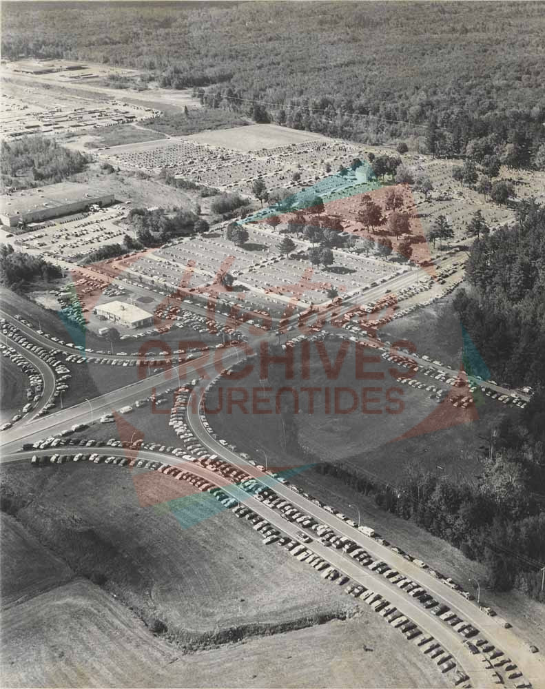 Cimetière de Saint-Jérôme lors d’une fête du cimetière. Les voitures sont stationnées dans l’entrée et la sortie de l’autoroute des Laurentides.