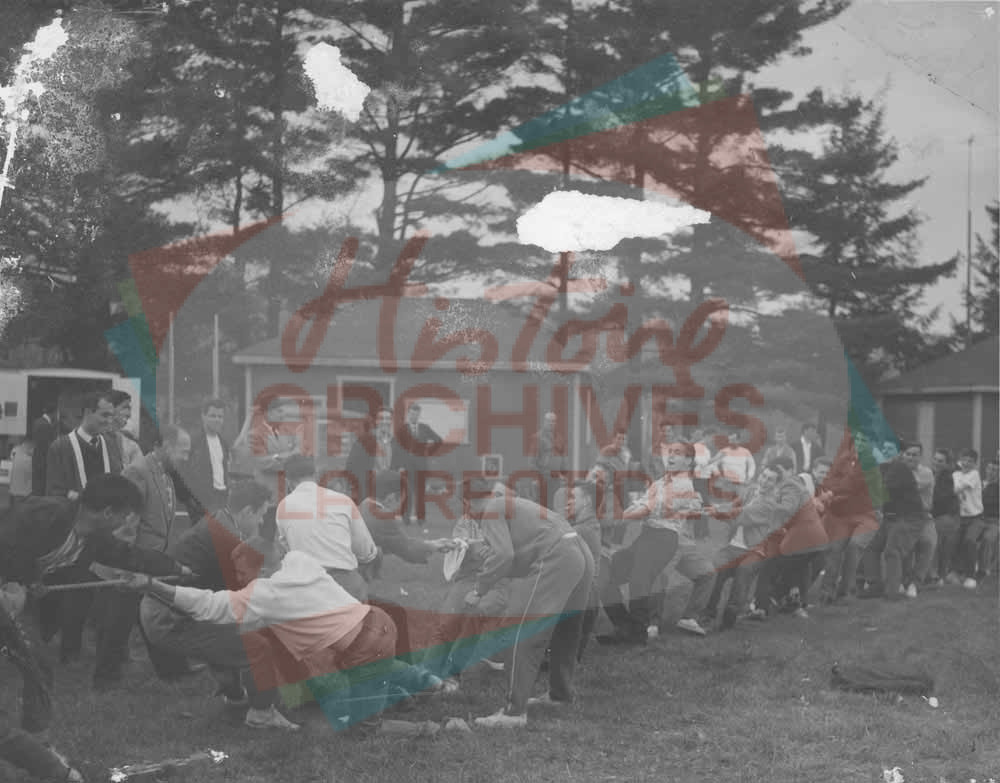 Étudiants du Collège commercial de Saint-Jérôme lors d’une sortie à l’île des Frères des Écoles chrétiennes. On les voit jouer au souque à la corde (tir à la corde).