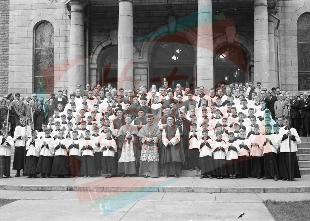 Groupe devant la cathédrale de Saint-Jérôme lors du congrès eucharistique. Au centre en avant, on peut voir le cardinal Paul-Émile Léger et Mgr Émilien Frenette, évêque du diocèse de Saint-Jérôme, à sa droite.