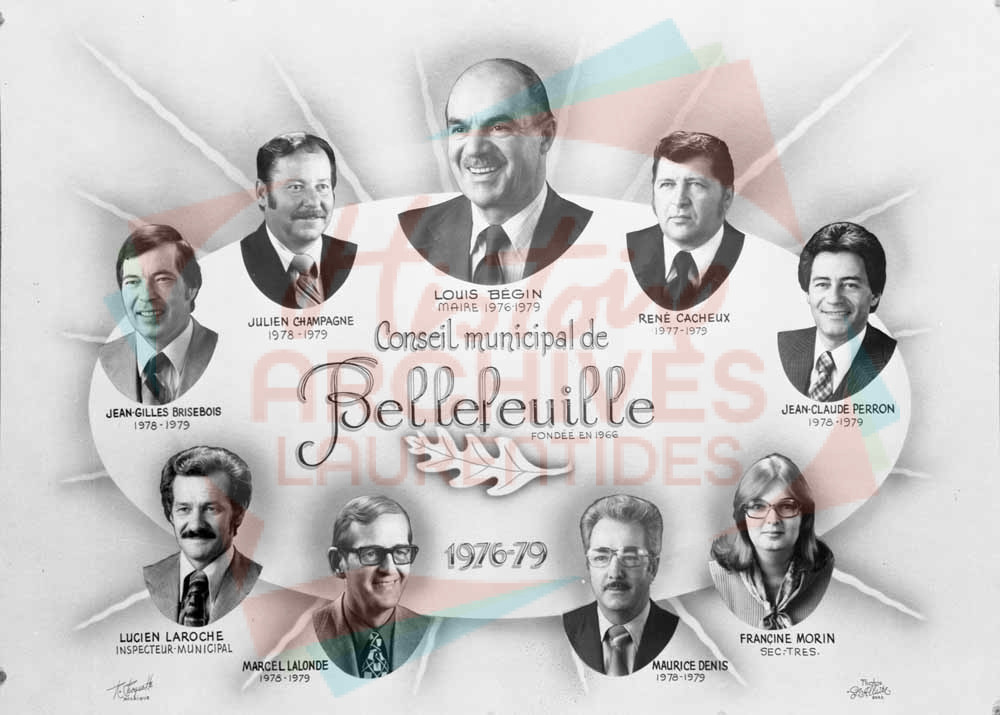 Conseil municipal de Bellefeuille, composé du maire Louis Bégin, des conseillers René Cacheux, Jean-Claude Perron, Maurice Denis, Marcel Lalonde, Jean-Gilles Brisebois et Julien Champagne, ainsi que de l’inspecteur municipal Lucien Laroche et de la secrétaire-trésorière Francine Morin.