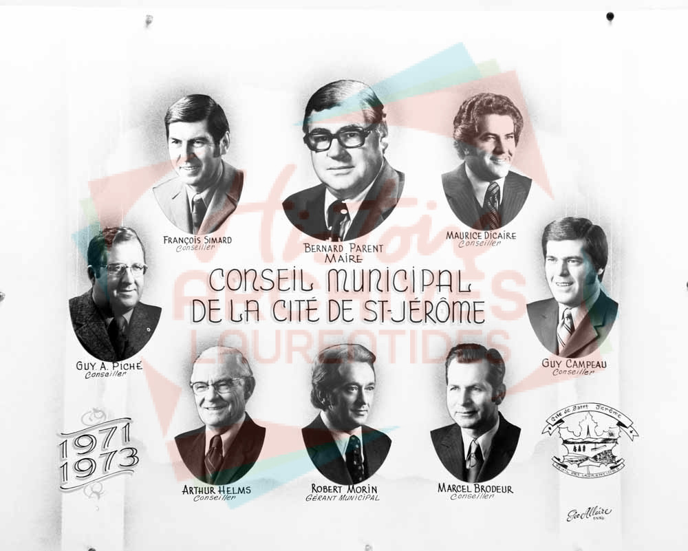 Conseil municipal de Saint-Jérôme, composé du maire Bernard Parent et des conseillers Maurice Dicaire, Guy Campeau, Marcel Brodeur, Robert Morin, Arthur Helms, Guy A. Piché et François Simard.