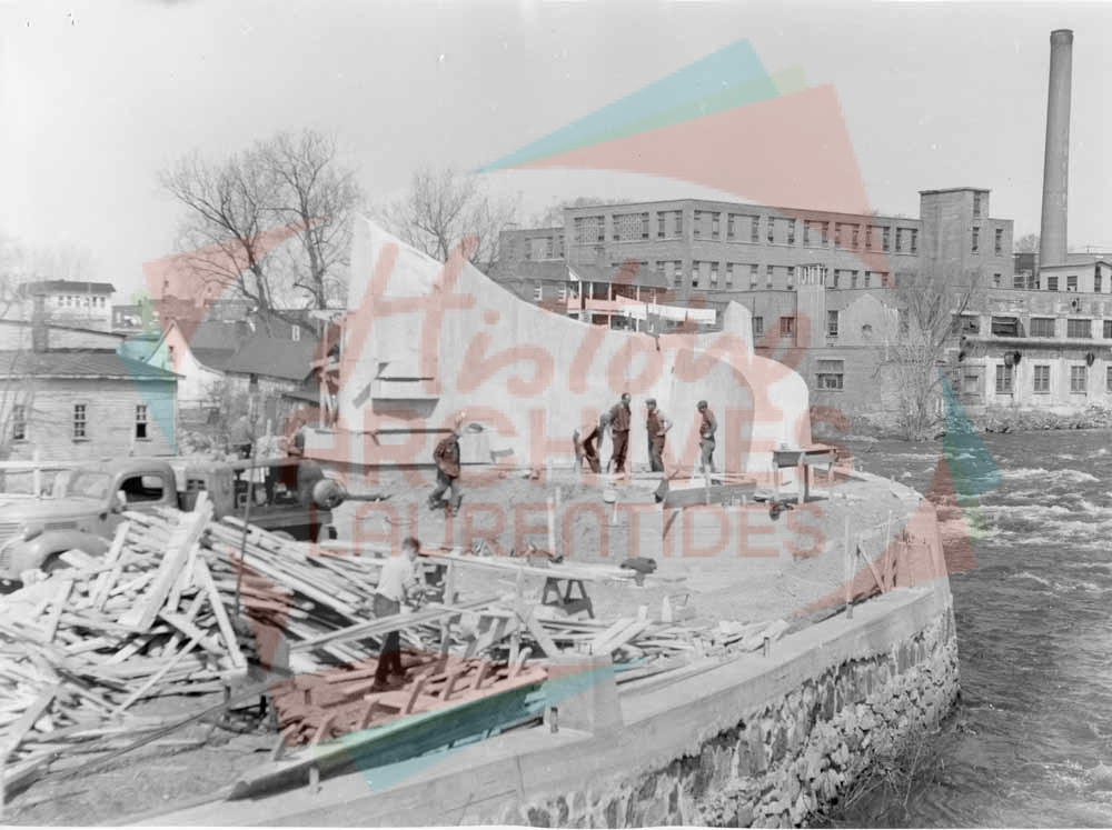 Construction de la grotte Sainte-Marcelle, à la pointe de l’île Perreault. En arrière-plan, on peut voir la Regent Knitting Mills.