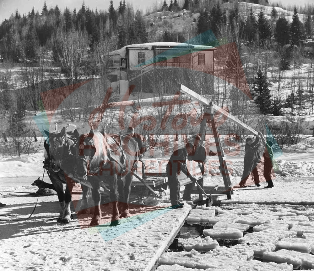 Groupe coupant de la glace chez Paquette, notamment pour construire le mur de glace du Sun Valley Farm.