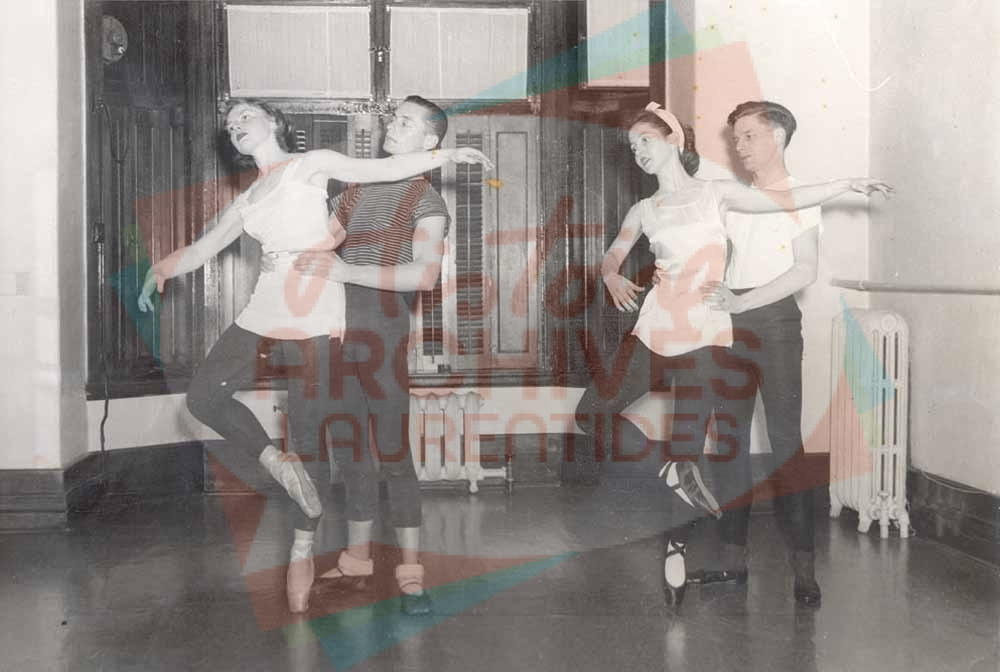 Deux couples de danseurs, en train d’exécuter un pas de quatre. Le premier couple est composé de Jacques Delisle et Françoise Sullivan et le second, de Paul Doré et Aline Legris.