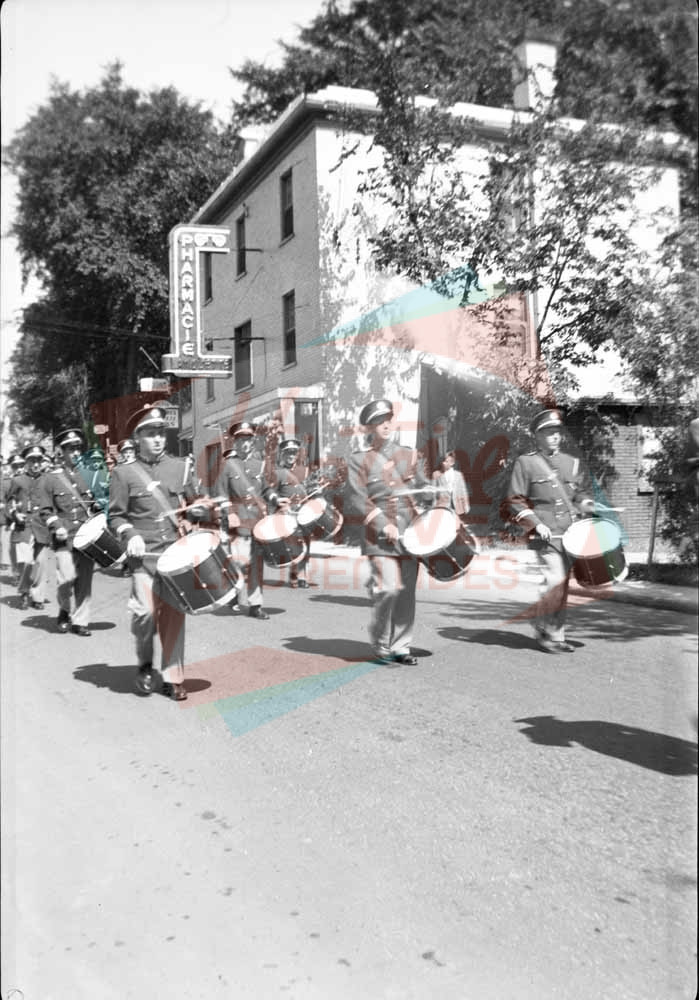Défilé de la Fanfare de Saint-Jérôme devant la pharmacie Laviolette à Saint-Jérôme, lors de la Saint-Jean-Baptiste et de leur centenaire.