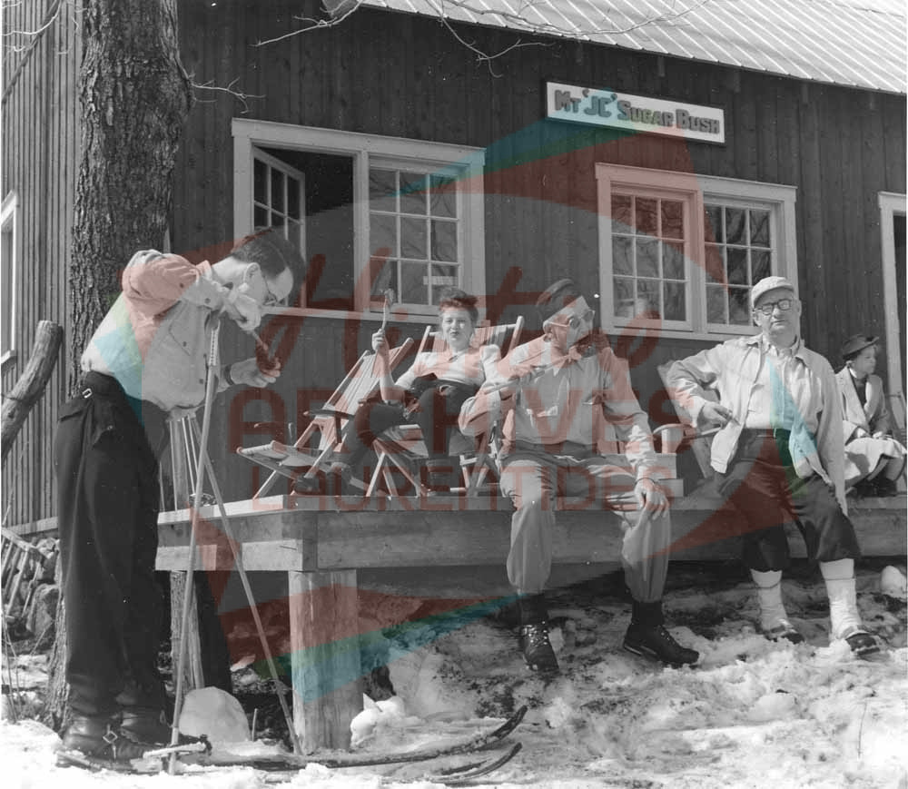 Groupe mangeant de la tire d’érable à la cabane à sucre située au sommet du mont JC à Val-Morin.