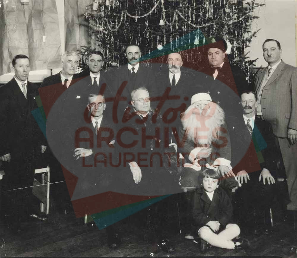 Dépouillement d’arbre de Noël des Chevaliers de Colomb de Saint-Jérôme. Assis, on voit Joseph Lebeau (grand chevalier), le curé Geoffrion, le père Noël personnifié par Euclide Huot, homme non identifié, enfant non identifié. Debout derrière, on voit trois hommes non identifiés, Odessa Quenneville, Raoul Lalande, le chef Arthur Lesage et Albert Thinel.