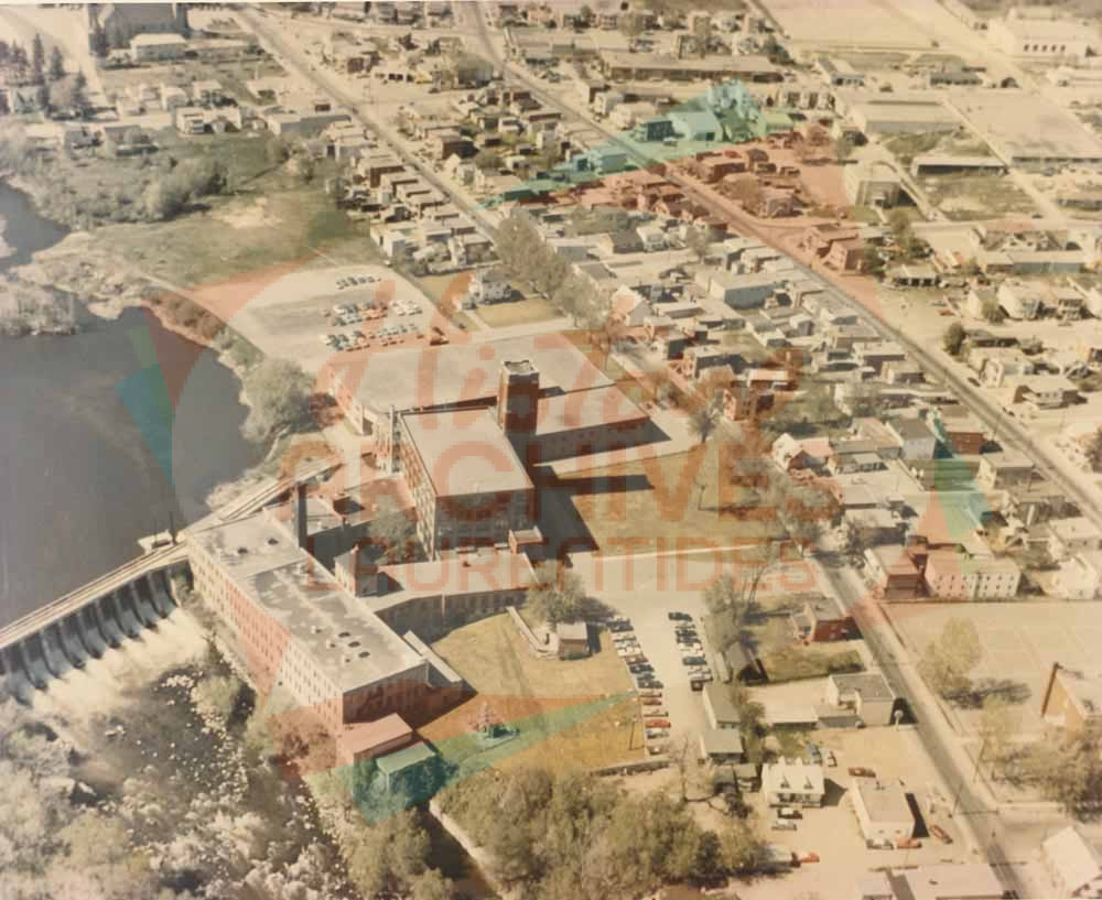 Vue aérienne de la Dominion Rubber Co., de la rivière du Nord et du quartier Saint-Joseph, à Saint-Jérôme.