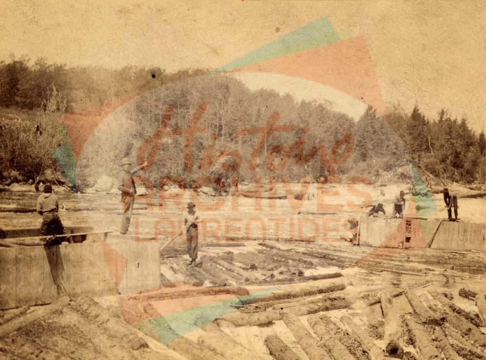 Drave (transport de billots de bois sur l’eau) sur la rivière du Nord à la hauteur des chutes Wilson à Saint-Jérôme.