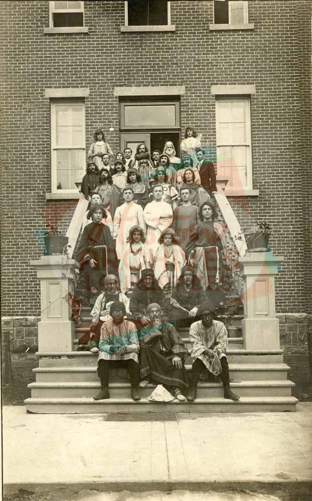 Groupe d’élèves costumés pour un événement dans les marches du Collège commercial de Saint-Jérôme.