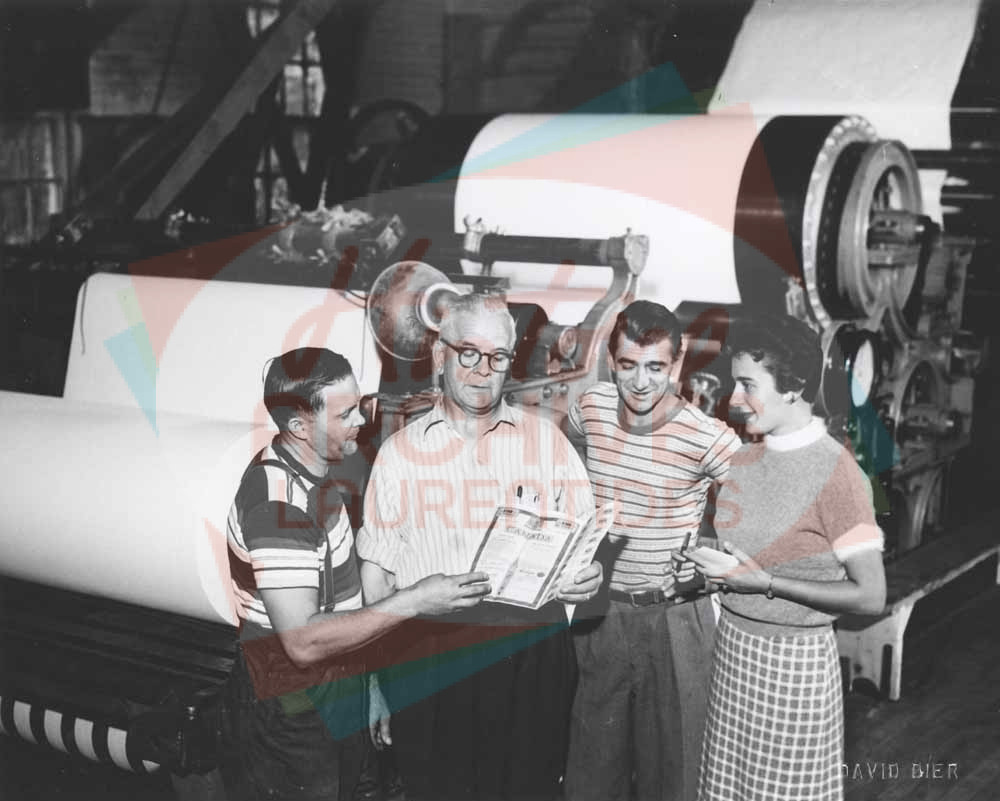 Employés de la Compagnie de papier Rolland à Saint-Jérôme, devant le « festoon » (séchoir) d’une machine à papier.