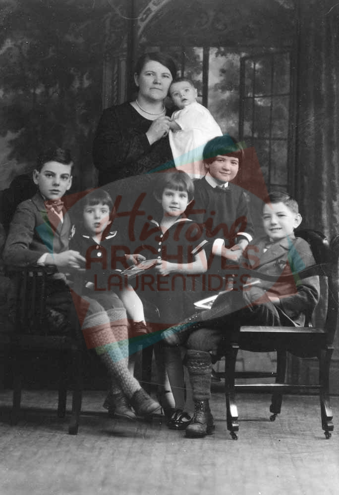 Rosa Gareau, épouse du photographe Georges Allaire, avec ses enfants : Louis de Gonzague, Réjean, Carmaine, Lucille, Marquis et Jean-Louis (bébé).