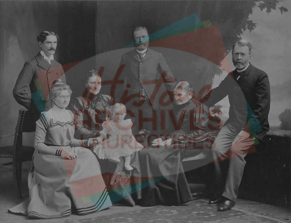 Famille d’André-Silfrid Delisle, fondateur de la pulperie Delisle (pulperie Wilson). On peut voir de gauche à droite, Charles Martel et son épouse Victoire Delisle, Leitia Finch (épouse d’A-S Delisle), Jean-Charles Martel (enfant), Zaringue Delisle, Flore Gaudry et André-Silfrid Delisle.