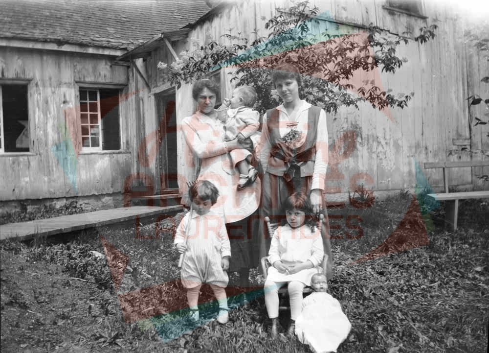 Hermine Smith et ses enfants Léandre, Henri et Louise Prévost, en compagnie d’une femme non identifiée, dans la cour arrière de la librairie de Jules-Édouard Prévost et du bâtiment du journal L’Avenir du Nord.