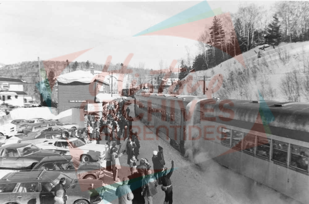 Gare du Canadien Pacifique de Sainte-Adèle. On voit plusieurs personnes saluer les passagers du train. Entre 1978 et 1981, Via Rail a proposé des trains de passagers avant de cesser ce service.