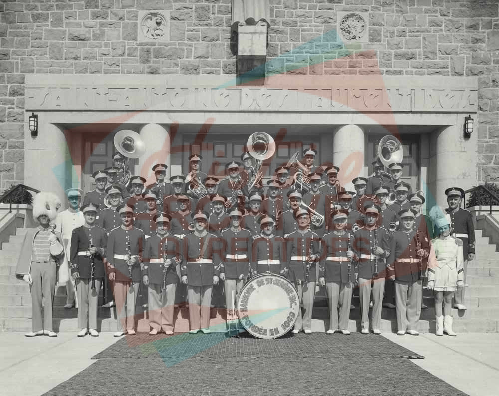 Musiciens de l’Harmonie de St-Jérôme Inc., en tenue officielle, devant l’église de Saint-Antoine-des-Laurentides.