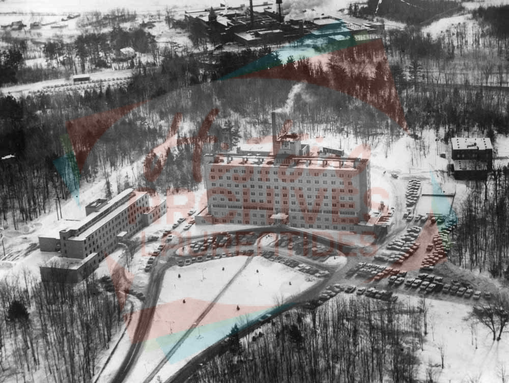 Hôtel-Dieu de Saint-Jérôme et à gauche, l’école des infirmières, construite en 1957.