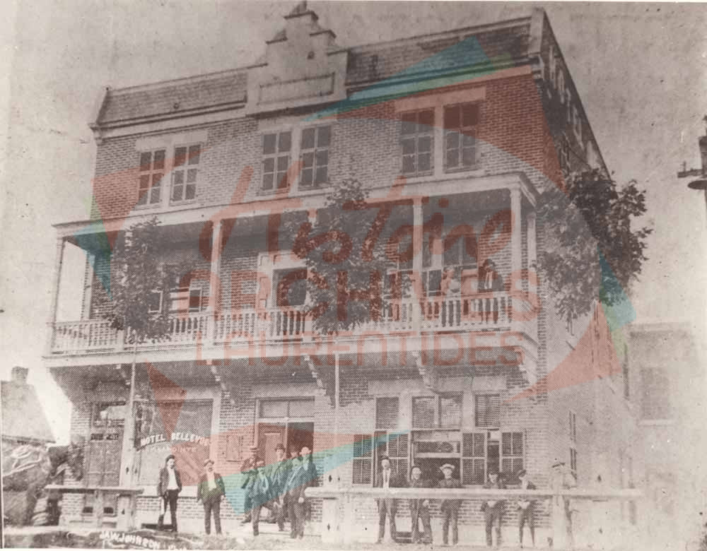 Hôtel Bellevue, qui s’est aussi appelé Hôtel Deschambault. En 1906, Alfred Lapointe achète l’établissement qui portera éventuellement son nom. On peut voir plusieurs clients devant l’entrée et au balcon. La barre horizontal en bois devant l’hôtel servait à attacher les chevaux des clients.