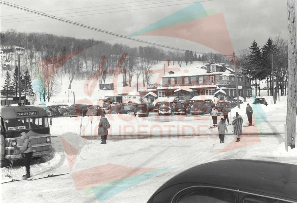 Hôtel Mont-Cassin de Shawbridge, situé au coin de la route 11 (route 117) et de la rue de la Station, à l’emplacement actuel du Faubourg de la station. Derrière se trouve la Côte Beaulieu avec un remonte-pente.