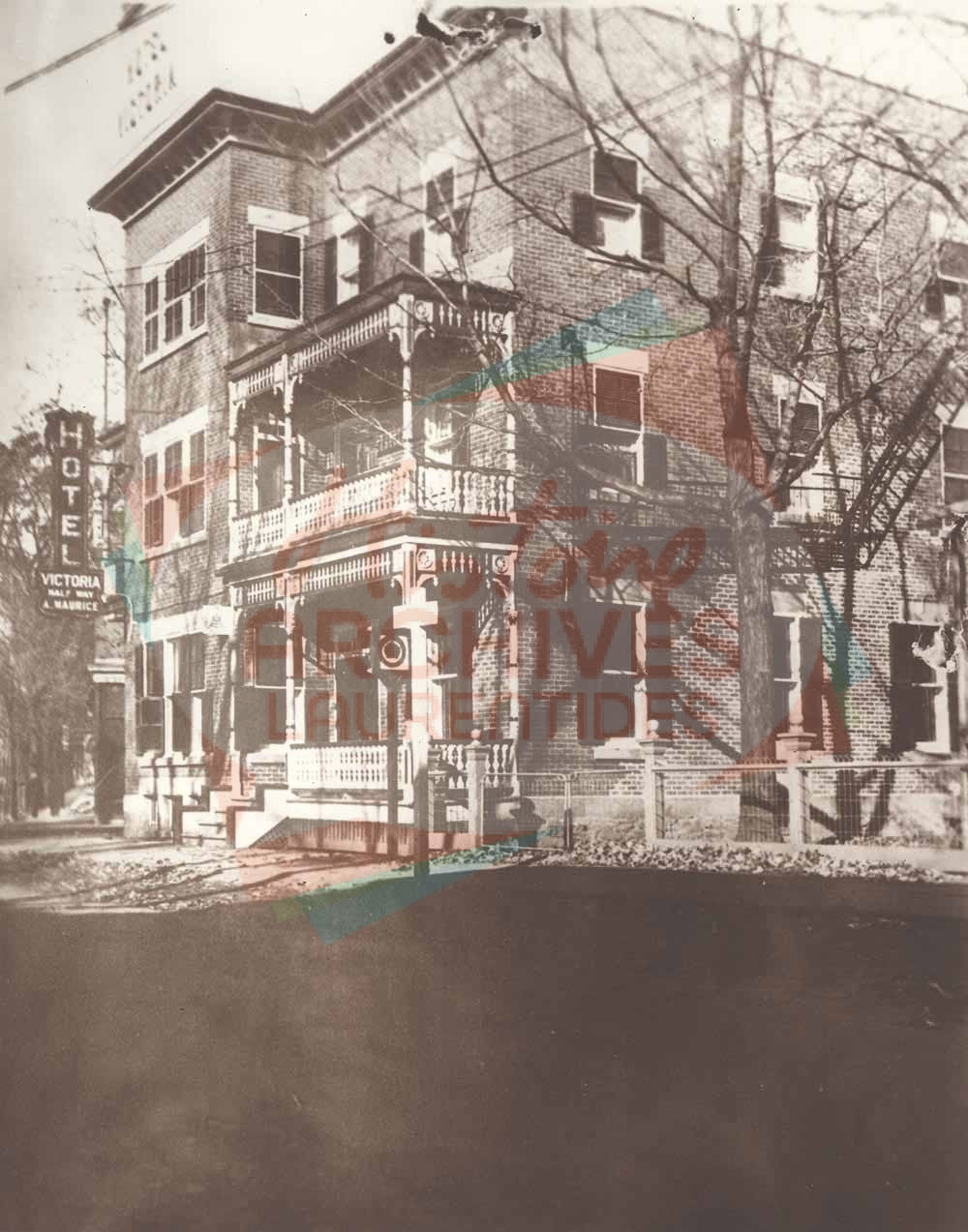 Façade de l’Hôtel Victoria qui deviendra l’Hôtel Maurice. Construite en 1878, la bâtisse située sur la rue Labelle, au coin de l’actuelle rue de la Gare, est achetée par Aurèle Maurice qui lui donnera son nom. Le bâtiment est incendié en 1984. Un stationnement occupe aujourd’hui l’emplacement de l’hôtel.