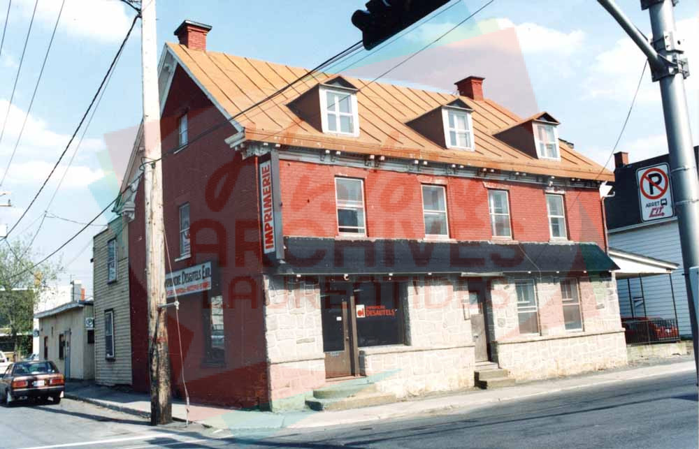 Imprimerie Desautels, située au coin des rues Bruno-Nantel (aujourd’hui rue Jean-Gibeault) et Labelle. Auparavant, l’hôtel de Jos Poulin s’y trouvait. Le bâtiment a été démoli.