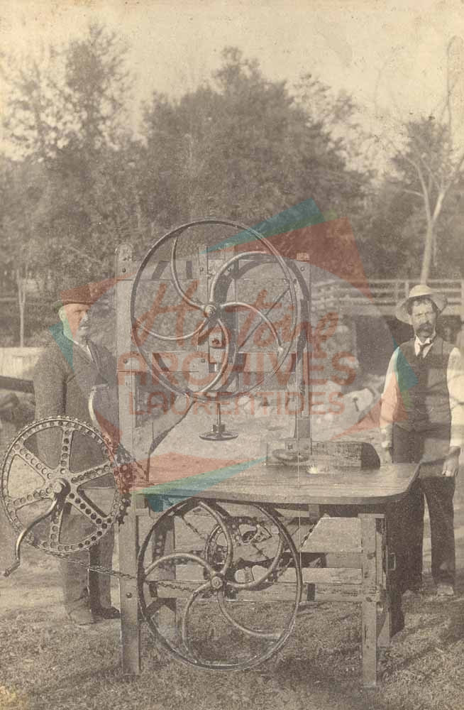 Édouard Drouin (à gauche) avec son invention, la «Champion combinée», pour travailler le bois.