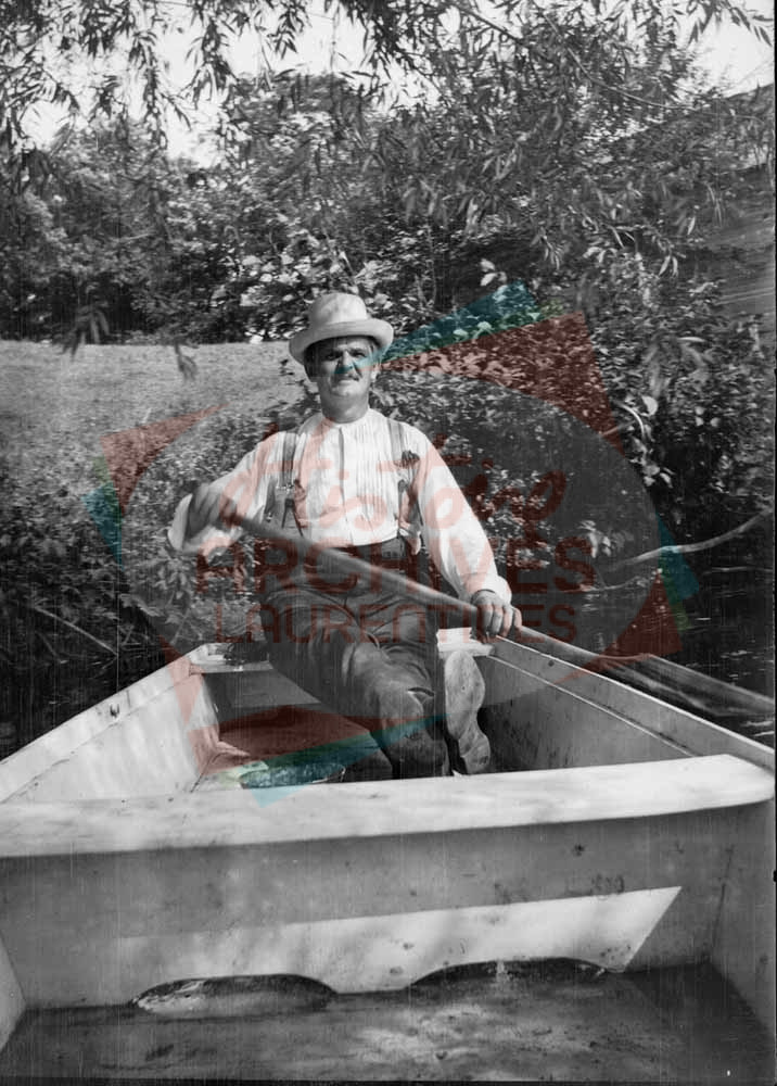 Jean Bouzelli, comédien belge arrivé à Saint-Jérôme en 1902, en chaloupe sur la rivière du Nord.