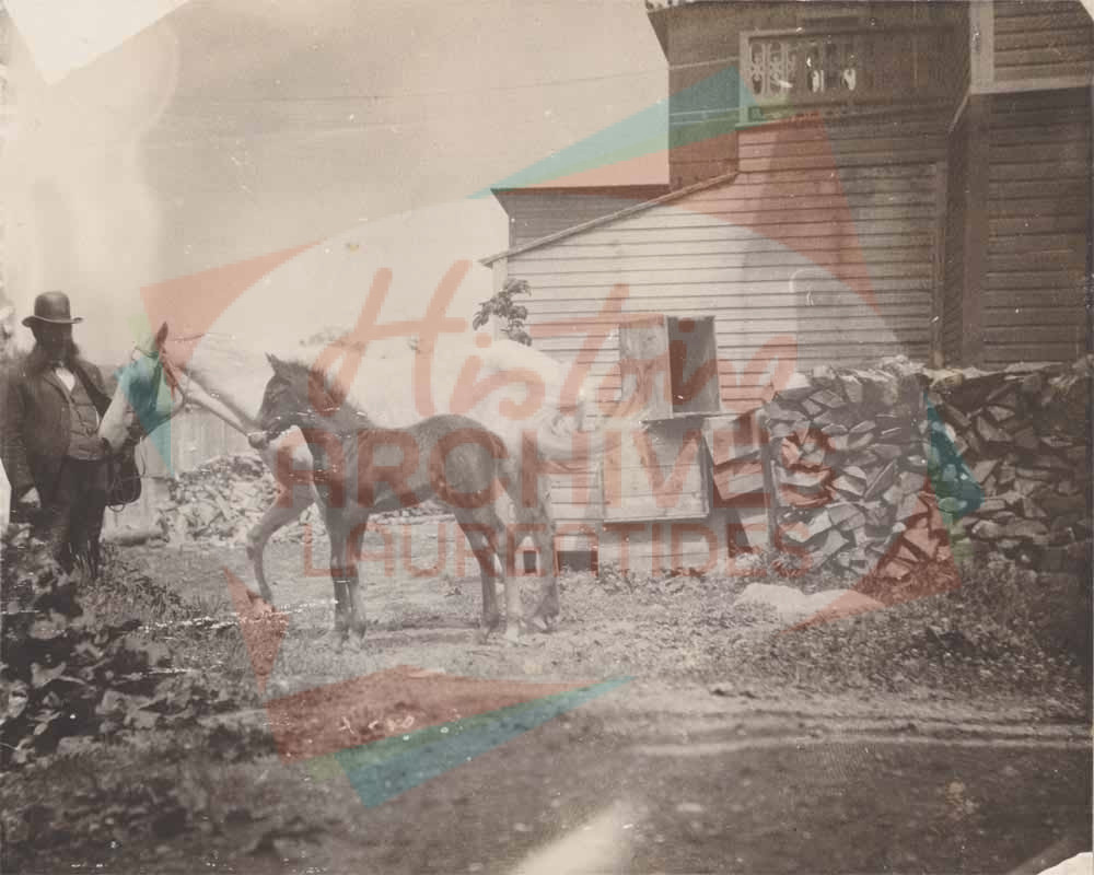 Homme aux côtés d’une jument et d’un poulain, dans la cour d’une maison.