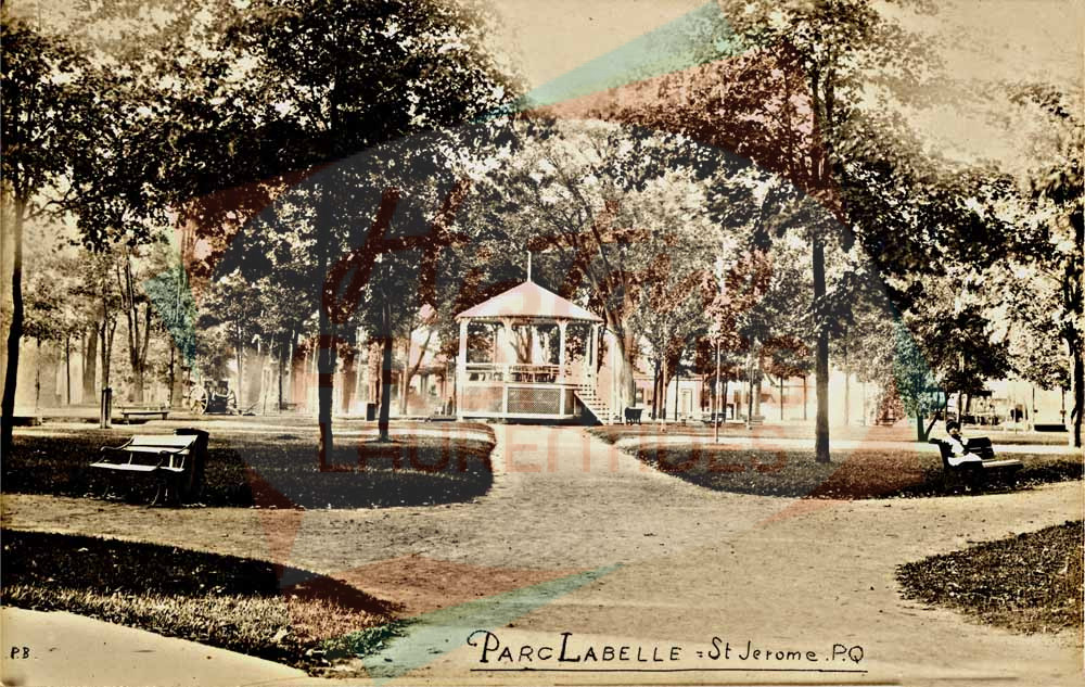 Kiosque situé dans le parc Labelle, qui déménage près du bureau de poste lors de l’inauguration de la statue du curé Antoine Labelle en 1924.