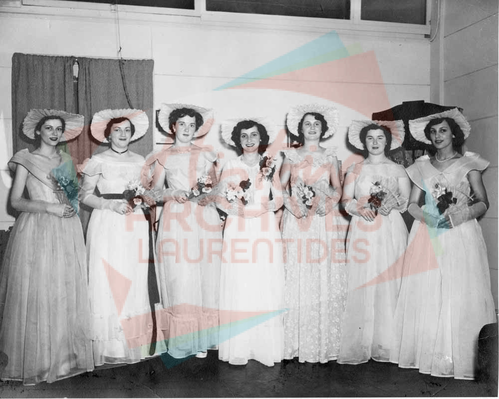 Groupe de femmes qui occupent le char allégorique La Jérômienne lors de la Saint-Jean-Baptiste de 1949. De gauche à droite, on peut voir Thérèse Léoonard, Rita Leroux, Lucille Fauvelle, Manon Martin (La Jérômienne), Cécile Papineau, Aimée-Rose Dupras, Gisèle Legault.