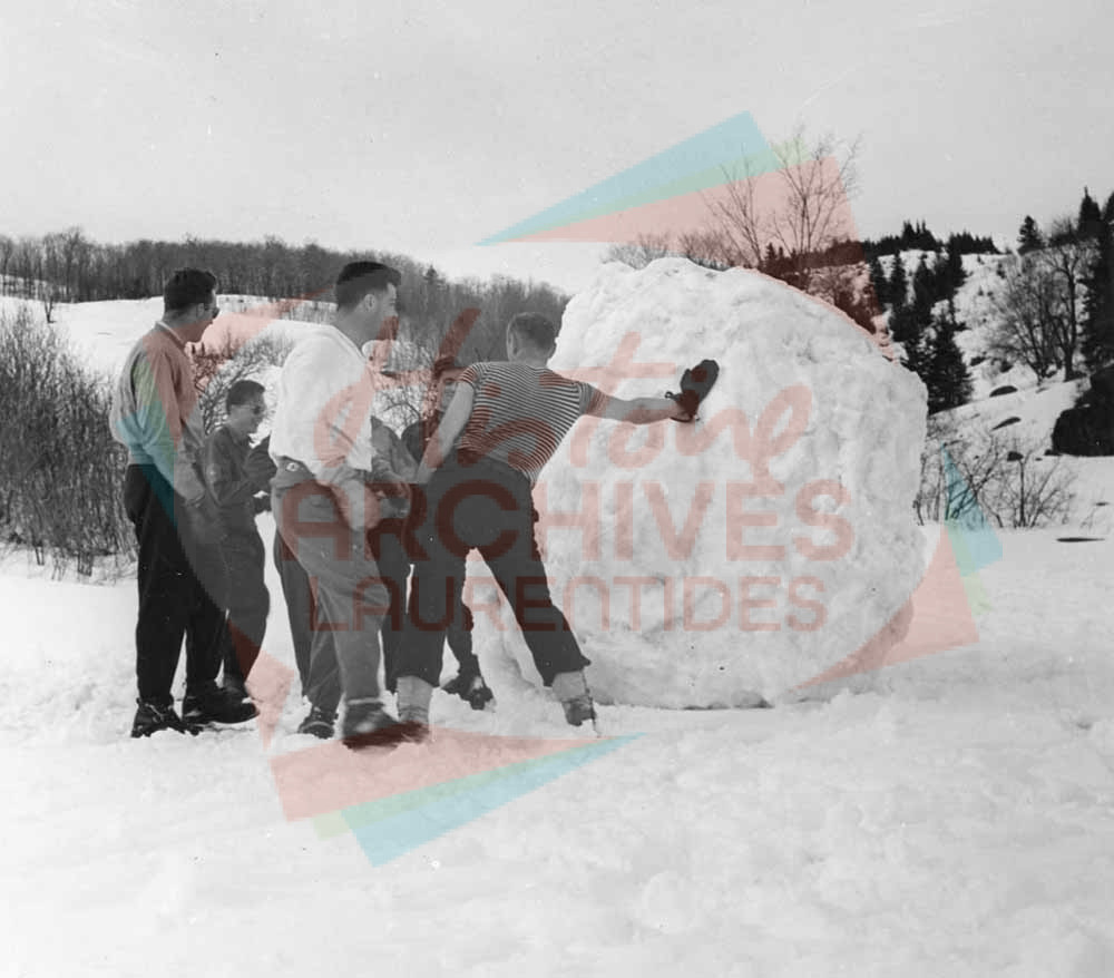 Groupe d’hommes formant une grosse boule de neige à l’Hôtel Sun Valley Farm.
