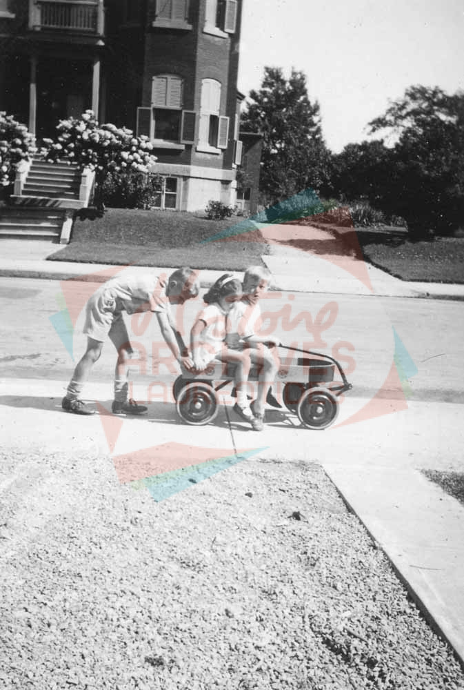 Enfant qui pousse la brouette avec deux autres enfants assis à l’intérieur.