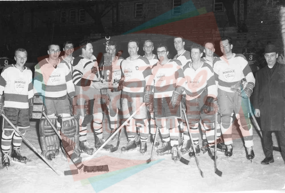 Joueurs de la ligue de hockey du Moyen-Âge, fondée en 1964, lors d’une remise de trophée. La ligue est encore en activité.