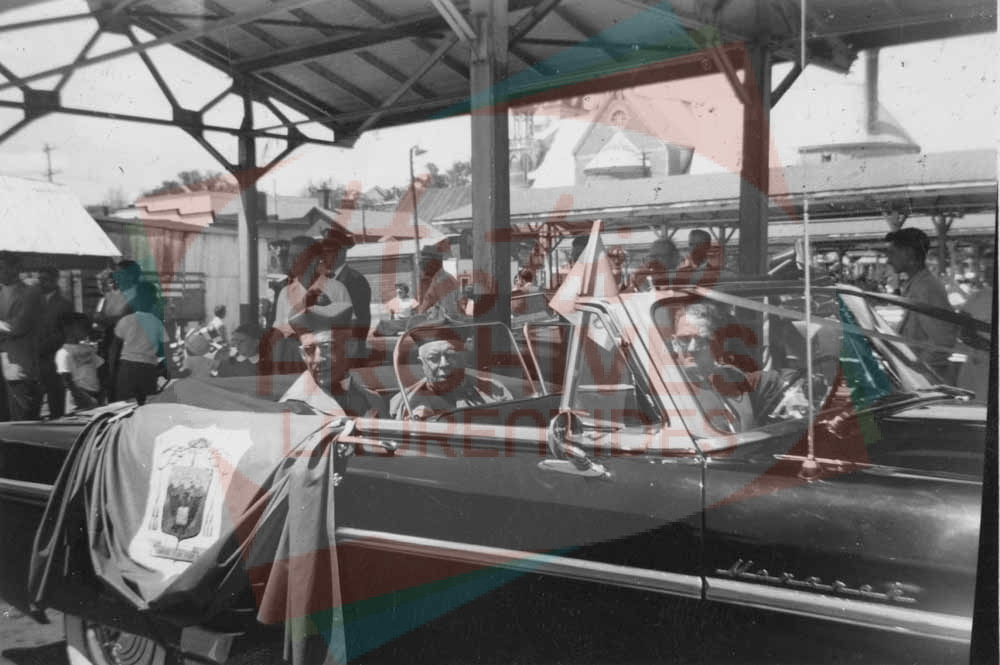 Mgr Frenette et le curé Philippe Labelle en voiture au marché public de Saint-Jérôme lors de la Saint-Jean-Baptiste.