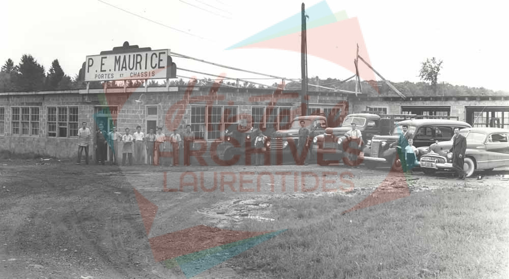 Employés devant l’usine de portes et châssis P.E. Maurice, sur le boulevard des Laurentides.