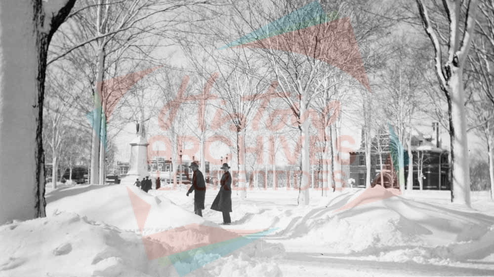 Parc Labelle de Saint-Jérôme sous la neige. En arrière-plan à droite, on peut voir le bureau de poste sur la rue Labelle.