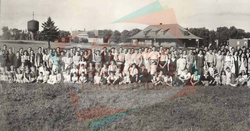 Pique-nique des employés de la Regent Knitting Mills de Saint-Jérôme. En arrière-plan, on peut voir la gare du Canadien National et le Collège commercial.