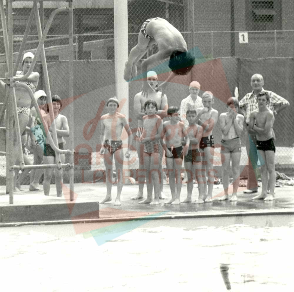 Jeune plongeant à la piscine municipale du parc De La Durantaye de Saint-Jérôme, sous le regard d’une petite foule.