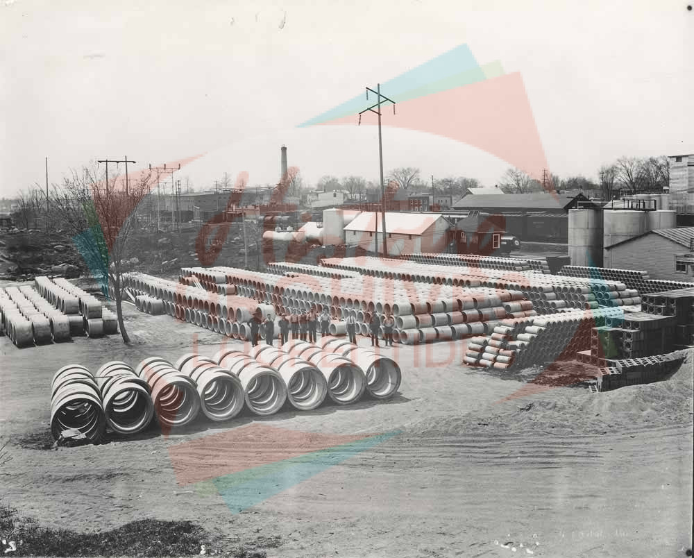 Ouvriers dans la cour arrière de la manufacture des Produits ciment Saint-Jérôme Ltée, située en face de la gare du Canadien Pacifique.