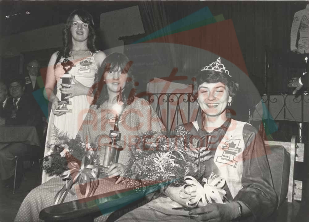reine du Club de motoneige des Laurentides, assise avec son bouquet entre les mains.