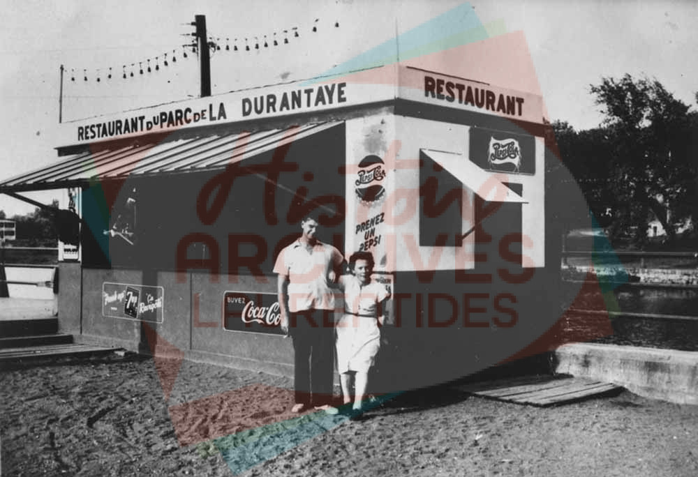 Restaurant du parc De La Durantaye, situé en bordure de la rivière. On voit un couple devant le restaurant.