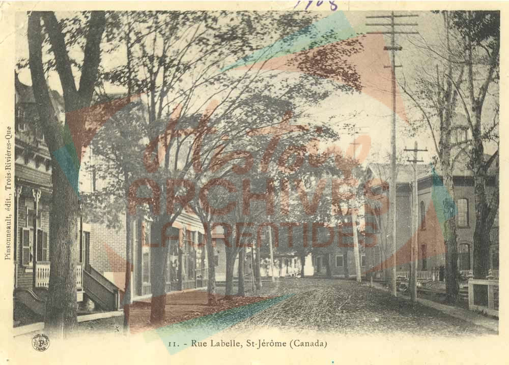 Rue Labelle avec ses grands arbres. On peut voir l’hôtel de ville de Saint-Jérôme à droite.