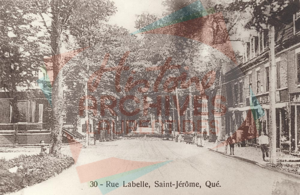 Rue Labelle à Saint-Jérôme, à partir du parc Labelle. À droite, on peut voir le commerce de Jules-Maximin Richard, incendié en mars 1915.