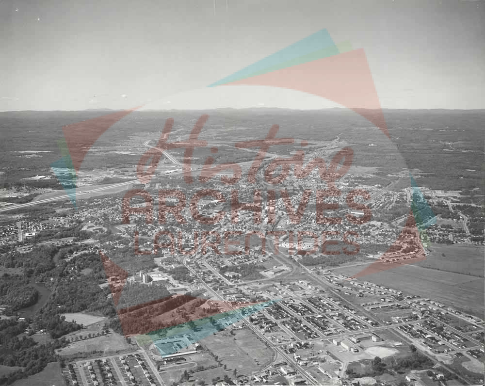 Saint-Jérôme, avant la construction du Carrefour du Nord en 1976. On voit bien l’autoroute des Laurentides qui traverse la ville et poursuit son chemin vers le nord.